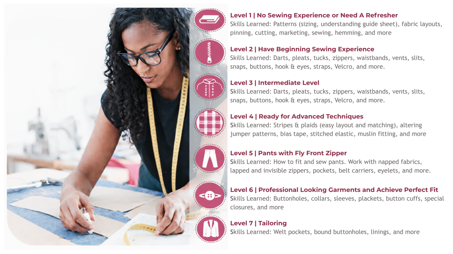 Your skills and knowledge grow with each level as projects increase in complexity. By the time you complete Level 7, you’ll be an experienced sewist.